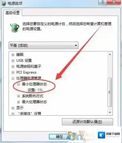 6、最小处理器状态选项处,可以设置处理器的最小使用百分比。