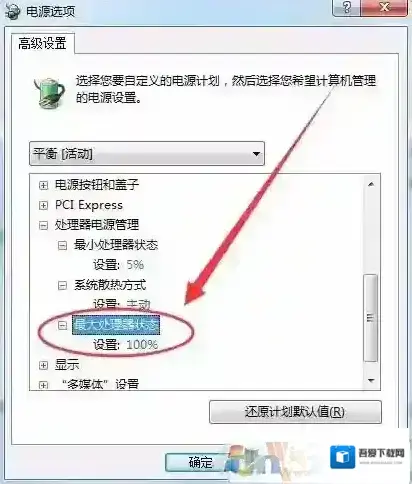 8、最大处理器状态选项处,可以设置处理器的最大使用百分比。