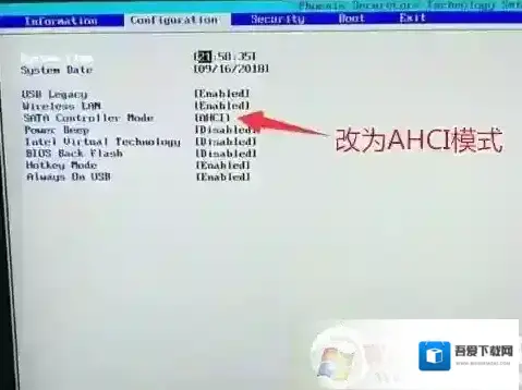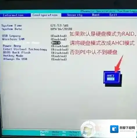 (注:改了legacy传统模式后,注意要将硬盘分区格式改成MBR的。6、注意:再返回configuration这项,查看sata controller mode这项,如果默认硬盘模式为RAID,请将硬盘模式改为AHCI模式,否则进PE后不能认出硬盘,如果更改后记得按F10保存,如下图所示;