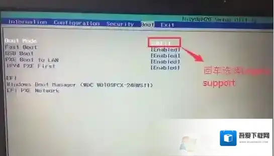4、切换到Boot,把Boot Mode从UEFI改成Legacy Support传统引导,部分机器也可以采用uefi安装,但保险点还是改成传统模式,如下图所示;
