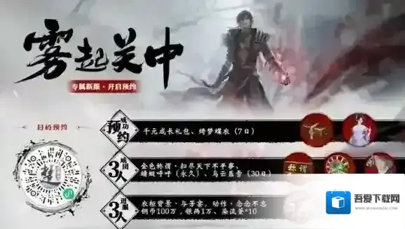 新的冒险即将启程,春季特典版本专属新服“雾起关中”也已开启预约!与亲友一同组队,成功预约更有千元成长礼包、永久挂件、衣柜背景、限定金色称谓与海量铜钱、银两等丰厚好礼等你来拿!赶快扫描下方小程序码,预约加入新服!