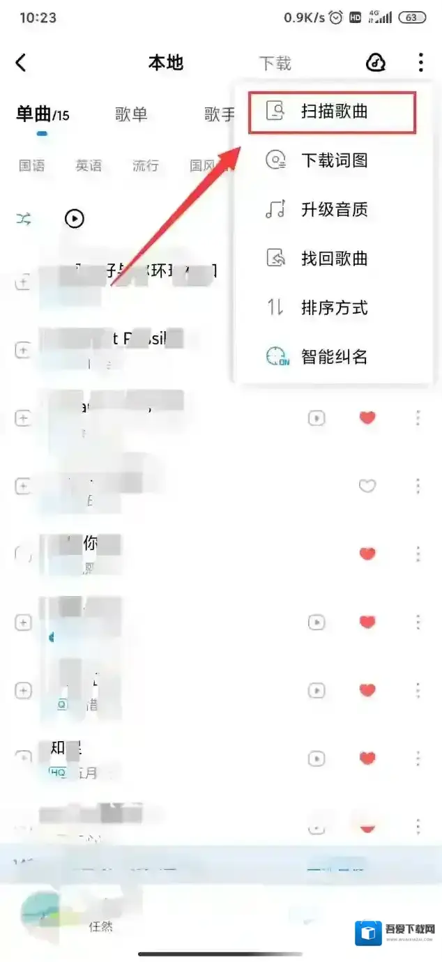 3、进入本地歌曲页面后,点击右上角“:”后,点扫描歌曲。