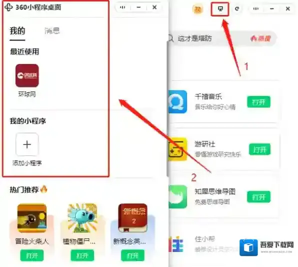 同样是在360小程序中心页面,点击右上角的“360小程序桌面”图标,就会弹出一个新窗口,显示用户最近使用和添加过的小程序,并为用户汇总接收到的小程序消息。用户可以直接在360小程序桌面上,打开已添加的小程序,这样就不需要打开浏览器了。