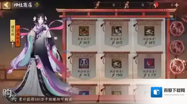 ※神社商店:大人可使用收集的「千丝缘结」兑换SR阶式神樱花妖皮肤「浮樱咏夜」、动态头像框「缘力百变」、活动插画、御行达摩、SP/SSR式神召唤券等奖励。