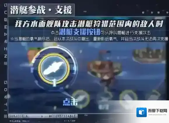 我方水面舰队攻击潜艇狩猎范围内的敌人时,点击潜艇支援按钮可以呼叫潜艇进行支援攻击。(当潜艇的氧气耗尽后,会从本次战斗中撤出,重新补给氧气,并且当次战斗无法再次支援)