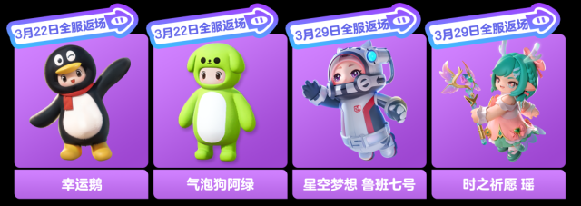 新赛季更有人气时装返场!“幸运鹅”和“气泡狗阿绿”也成功打破“次元壁”星宝们有机会将它们一起收入囊中了还有超高人气的“星空梦想 鲁班七号”和“时之祈愿 瑶”也将一起返场啦星宝们千万不要错过哦~