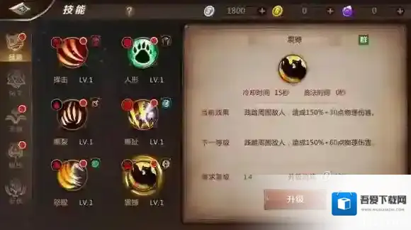 震撼:群攻技能,冷却时间15秒。对自身周围敌人造成150%攻击+大量物理伤害。