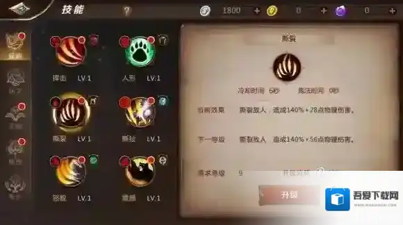 撕裂:单体攻击技能,冷却时间6秒,撕裂敌人,造成140%攻击+大量物理伤害。
