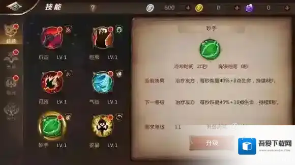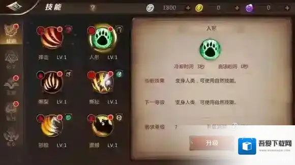 夜豹形态:变身夜豹,移动速度提升50%,并免疫所有控制效果,持续10秒,但是变身期间无法攻击,此状态可以手动取消,35级可开启此秘技。