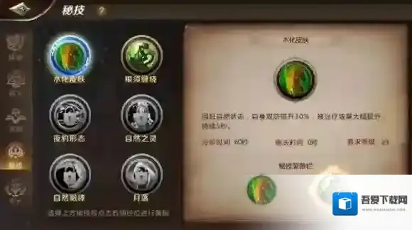 木化皮肤:自身BUFF。提高自身双防30%,大幅提高自身被治疗效果,持续5秒,23级开启技能。