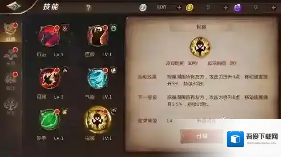 辅助BUFF,冷却时间为30秒。祝福周围所有友方,提升攻击力与移动速度,持续30秒。