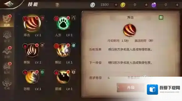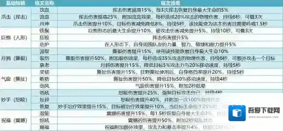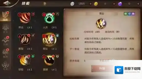 撕扯:群攻控制技能,冷却时间18秒。对前方所有敌人造成80%攻击+大量物理伤害,并将敌人拉到自己面前。