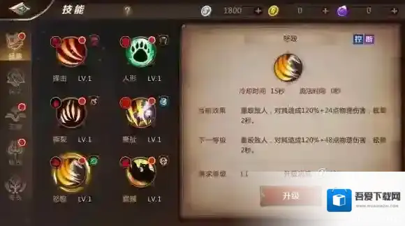 变身技能,冷却时间3秒。使用技能后变身为巨熊,提高自己的生命与物理防御,可以使用野兽技能。