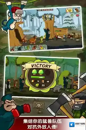 游戏中玩家们将会化身为一只灵活穿梭在森林中的猴子,带领自己的动物小伙伴们去抵御伐木工的进攻,将这些破坏生态环境的人类全部驱逐出森林!并且随着关卡的推进,可以去解锁更多不同类型的动物,利用好它们独特的能力可以助你闯过更多关卡。