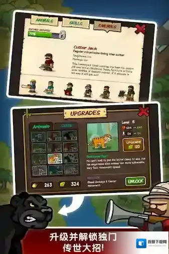 2、发现并升级猩猩、熊猫和这个野外世界里其他更多独特的角色和技能,它们都有自己特殊的能力。