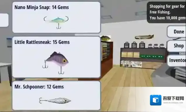3、选好地点后需要去购买装备,点击shop按钮来购买不同的钓鱼装备。