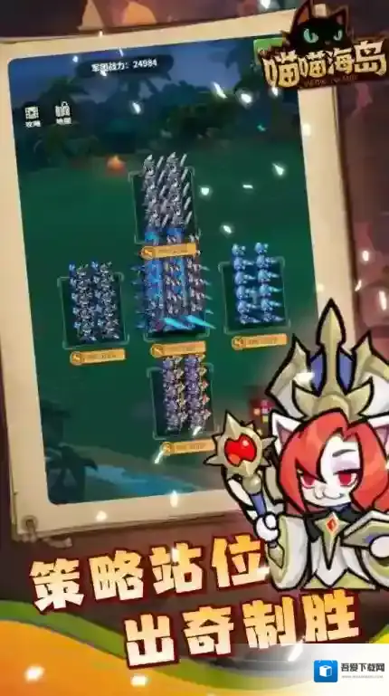 喵喵海岛,一款主打放置轻松和卡牌养成的策略游戏,玩家将指挥不同的猫咪士兵来击败对手赢得胜利。在游戏中有不同种族的兵种等你去选择,丰富的猫咪士兵可以让你自由选择来组建战队,丰富的怪物boss将等你去讨伐消灭,一边战斗一边修复建筑建设你的家园,不断征战来击败所有敌人保护你的家园。