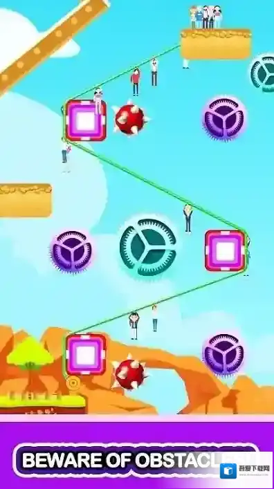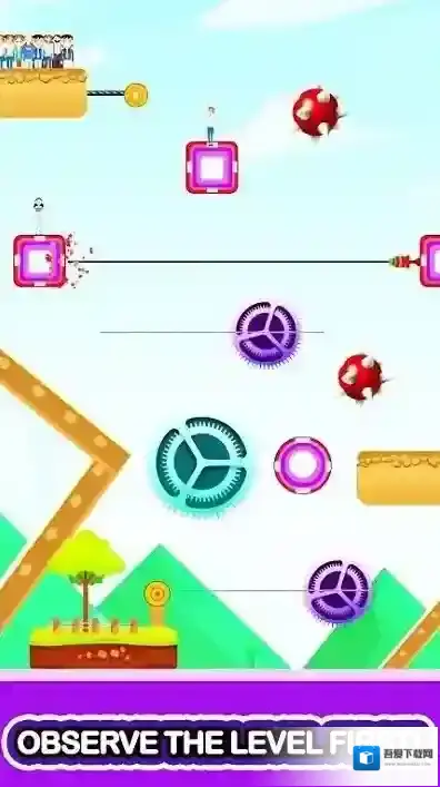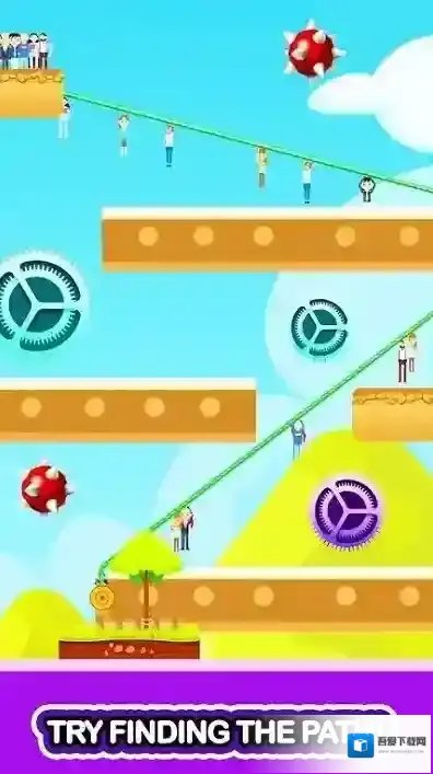 3、在救援关卡中,点击屏幕操控绳索挂接滑轮,躲避滚动刺球解救被困者,同时留意陷阱位置,合理规划救援路径。