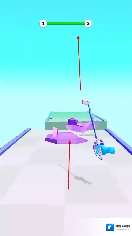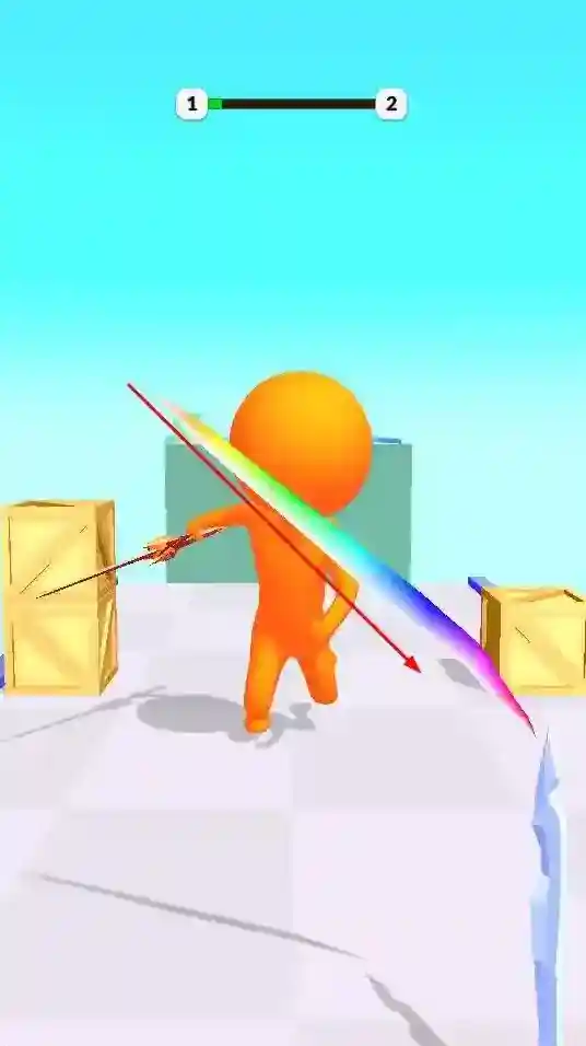 1、玩家操控彩色武器,通过滑动等操作让角色持武器在场景中前进,避开障碍物。