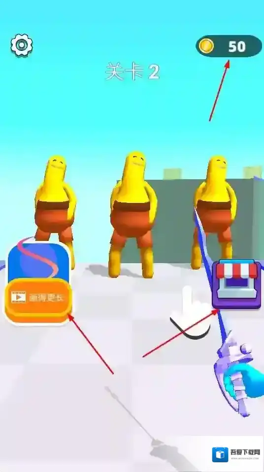 3、玩家在关卡中可获取金币等资源,还能通过点击“画得更长”等功能,提升武器长度,增强游戏能力,助力后续关卡挑战。