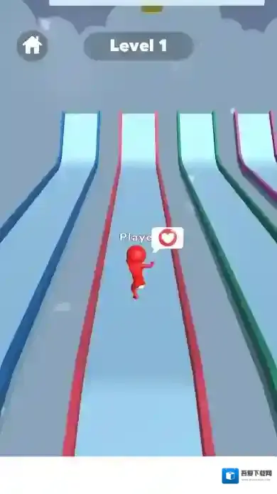 3、玩家操控红色小人在多个颜色不同的赛道中选择正确路径前进,避开危险区域,顺利通过关卡。