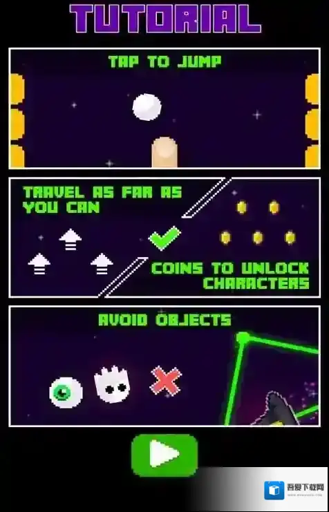 3、尽可能地让角色前进,途中收集金币,这些金币可用于【CHARACTERS】解锁角色。