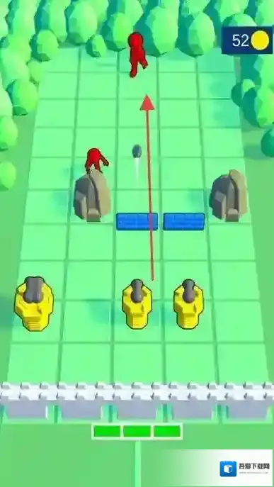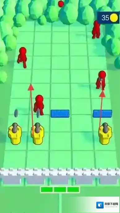 1、“布置防御塔”,在阵地放置黄色防御塔,自动攻击红色敌人,阻挡进攻路径。