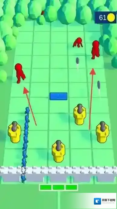 3、“抵御敌人”,红色敌人沿路径推进,防御塔与蓝色士兵合力攻击,守护阵地,完成关卡。