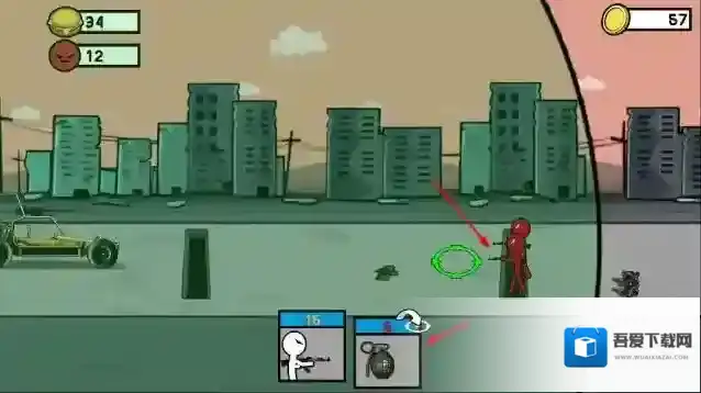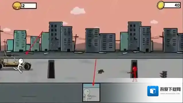 1、“操控移动”,控制白色火柴人,在城市废墟场景移动,躲避障碍(汽车、路障)。