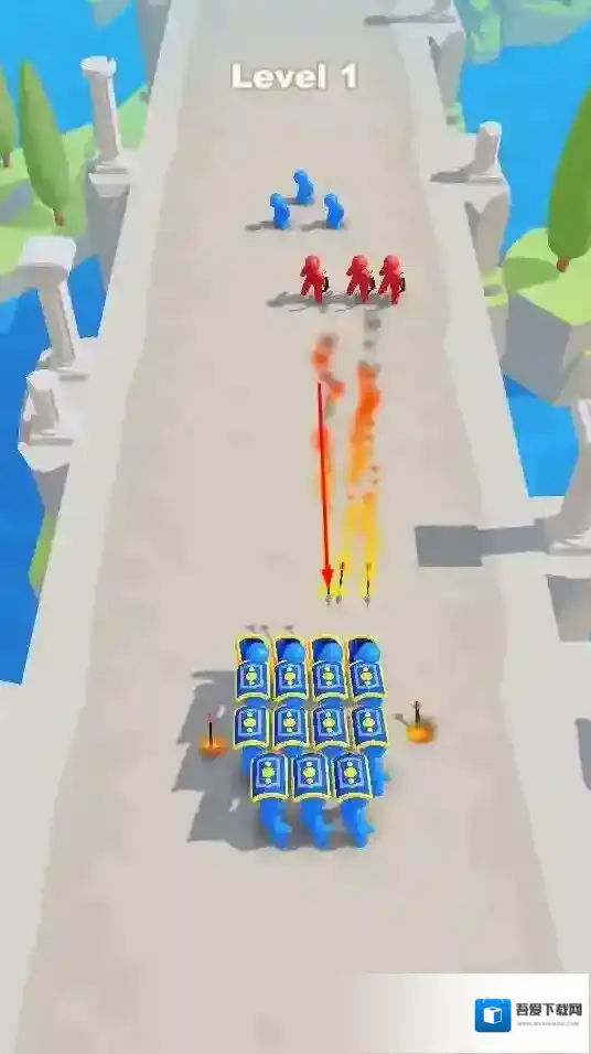 1、玩家操控蓝色小人组成的队伍,在关卡中与红色小人队伍对战,通过合理规划进攻路线,利用队伍优势击败对手。
