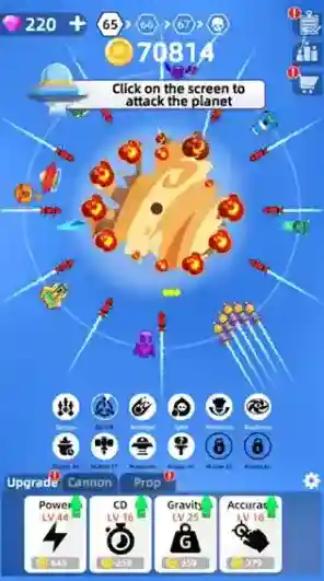3、积攒金币升级武器威力,后期面对大型行星时,需要预判碎片飞行轨迹,连续攻击才能完全摧毁。