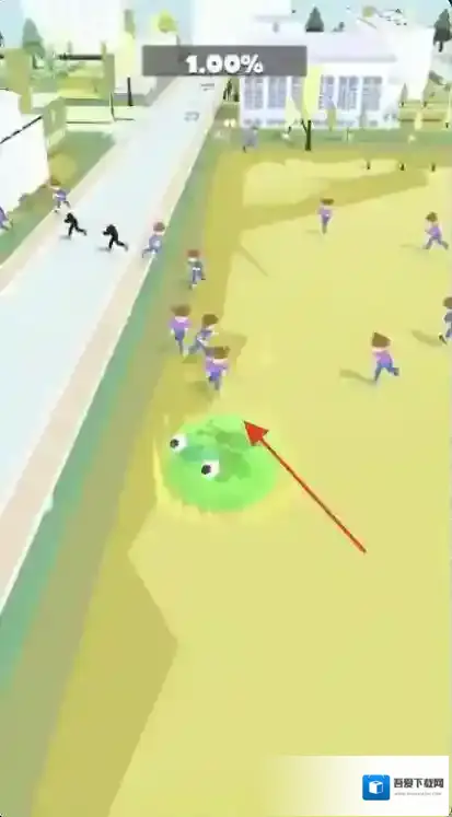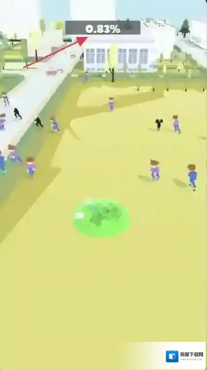 2、绿色球体碰撞人群后可将其吞噬,上方百分比数值随之增加,代表吞噬进度或积累资源。
