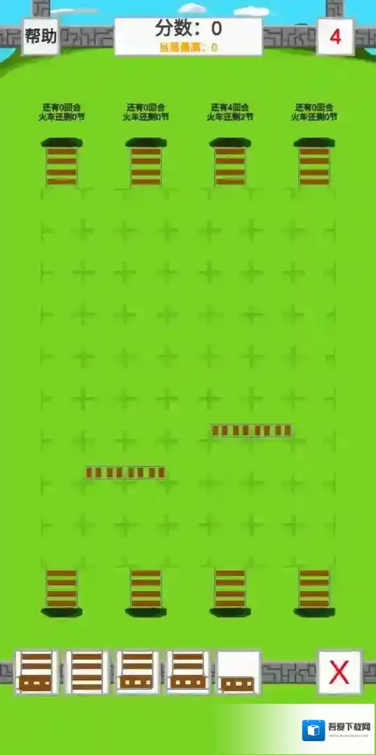2、进入游戏界面,根据火车起始位置和目标方向,从下方选取铁轨部件放置在方格中,规划合理路线,引导火车前进,过程中留意剩余回合数和火车节数。