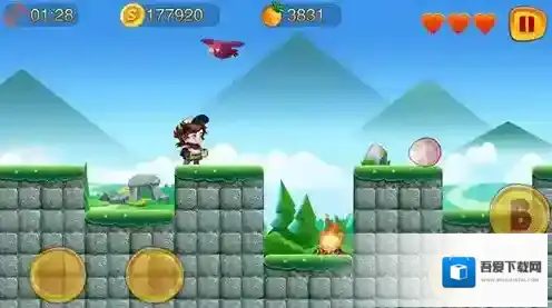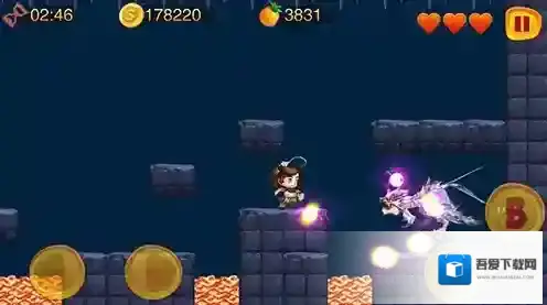 3、通过屏幕下方【A】【B】按键操控角色,收集金币,橙子等,注意躲避障碍和获取道具。