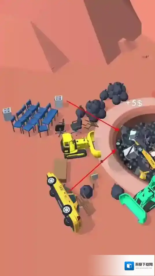 1、玩家操控推土机等机械,将场景中的物品推到大坑处,成功处理可获得金币奖励。