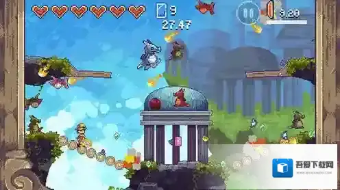 2、注意屏幕上方的生命值,魔法值等数值,操控角色躲避空中怪物,按红色箭头方向前进。