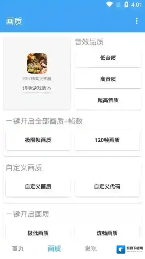 接着,打开画质助手功能,它支持修改吃鸡游戏的画质与音效等设置,并能开启高达120帧及极限帧的画质选项。