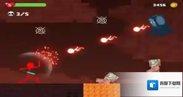 1、画面中世界场景(如砖块地面、熔岩、方块生物)中进行战斗,发射火焰球攻击敌人(如蓝色方块生物、僵尸模样的方块角色)。