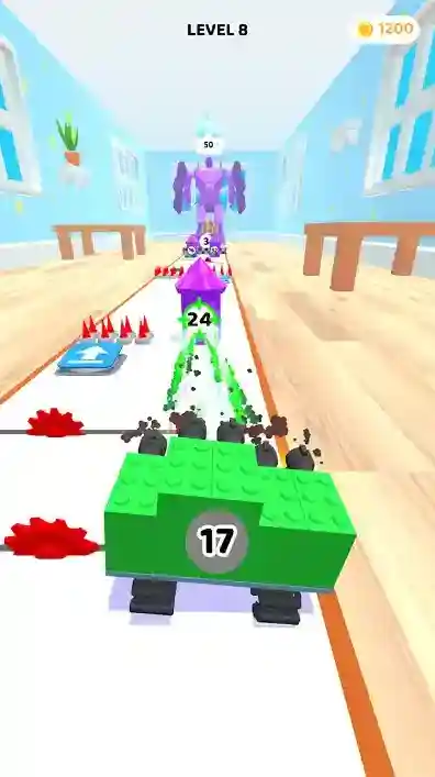 2、玩家在前进过程中收集绿色积木部件,提升战车等级,增强战车的攻击和防御能力。