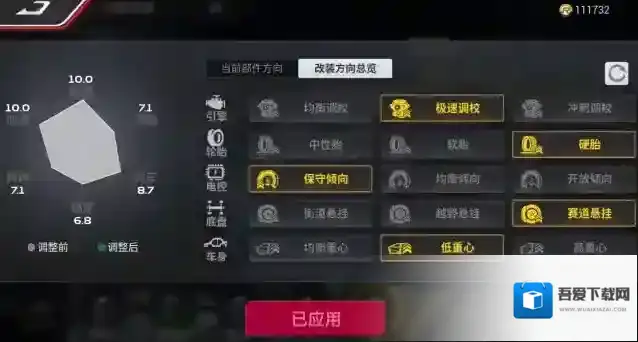 小极开过之后,自己比较喜欢的改装方向为:引擎-极速调教、轮胎-硬胎、电控-保守倾向、底盘-赛道悬挂、车身-低重心设定。保持车辆的最佳动态,将助你在成为车王的道路一臂之力。