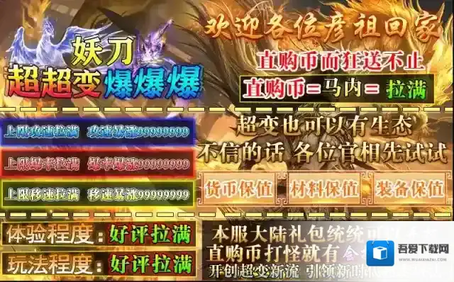妖刀超超变爆爆爆,195神器高爆单职业版本,零氪到底,白嫖到终极!上线攻速、爆率、移速直接拉满,打怪就能赚取直购币,可以兑换礼包,时间证明一切!本服所有大陆礼包统统可以靠打获得,并且货币、材料和装备全部都很保值,支持玩家之间自由交易,绝对的生态大服!来这里天天领充值,免费轻松过关,白嫖即可到终极,绝对让你玩的爽爽爽!